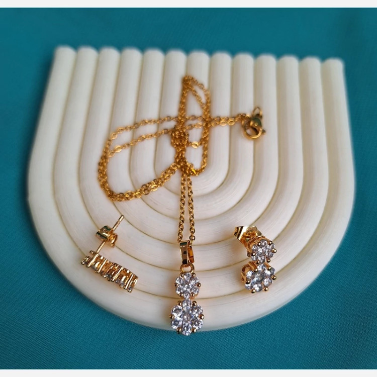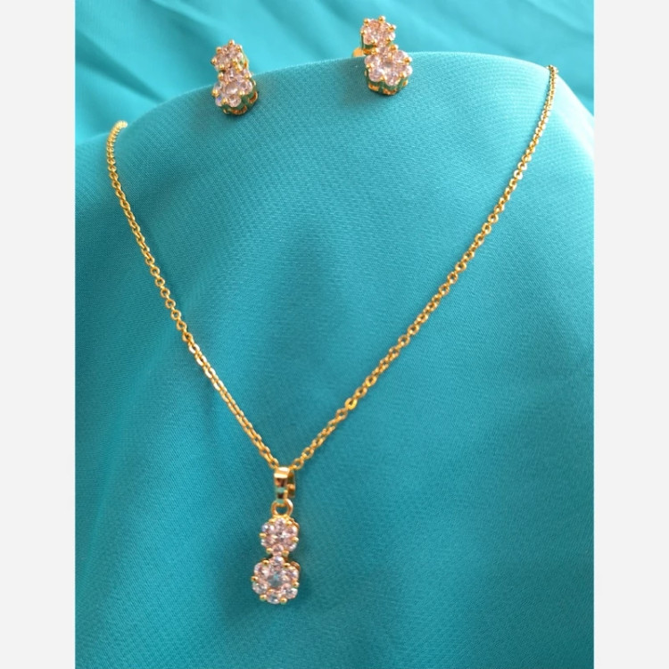 نیم ست فول نگین طرح دوگل شامل گردنبند و یک جفت گوشواره میخی طلایی رنگ ثابت کیفیت عالی قفل طوطی