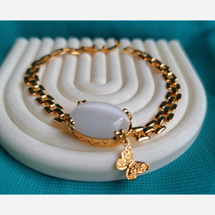 دستبند نگین سفید با آویز طلایی پروانه رنگ ثابت کیفیت عالی زیبا و چشم نواز بند ساعتی قفل کتابی 19 سانتی متر