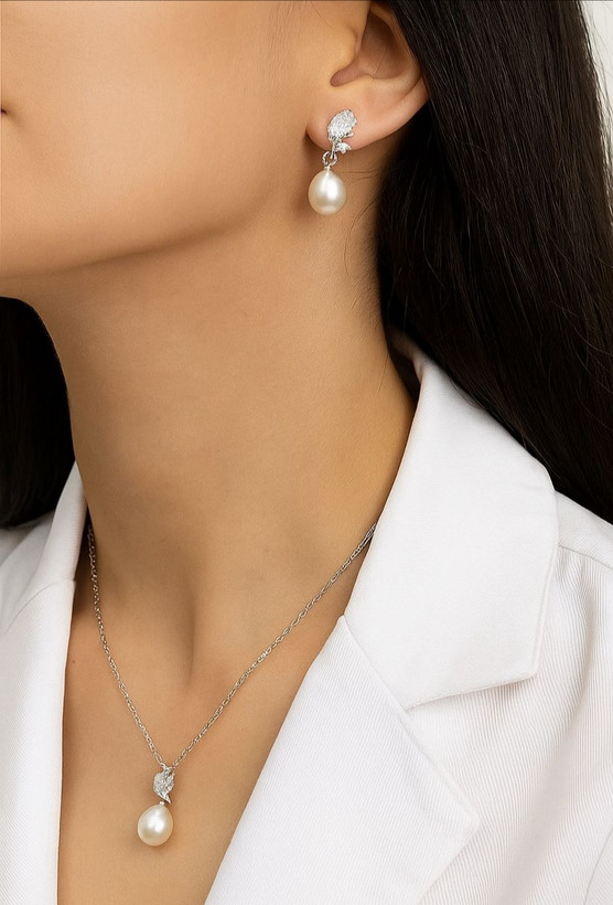 نیم ست نقره مروارید شامل یک جفت گوشواره میخی و یک گردنبند همراه با زنجیر میباشد، آبکاری رادیوم شده، بدون تغییر رنگ بدون ایجاد حساسیت