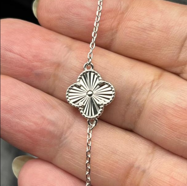 یک دستبند سبک و راحت با طول 17سانت و 3سانت زنجیر رگلاژ، کیفیت گرید یک، نقره ای و تراش خورده، آبکاری رادیوم