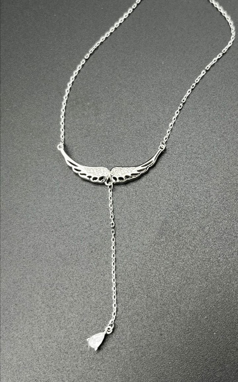 گردنبند نقره با طراحی بسیارشیک بال فرشته با 4سانت زنجیر اویزان در وسط، اندازه زنجیر 40و سه سانت زنجیر رگلاژ دارد، جنس نقره 925 آبکاری شده، فاکتور همراه سفارش ارسال میگردد