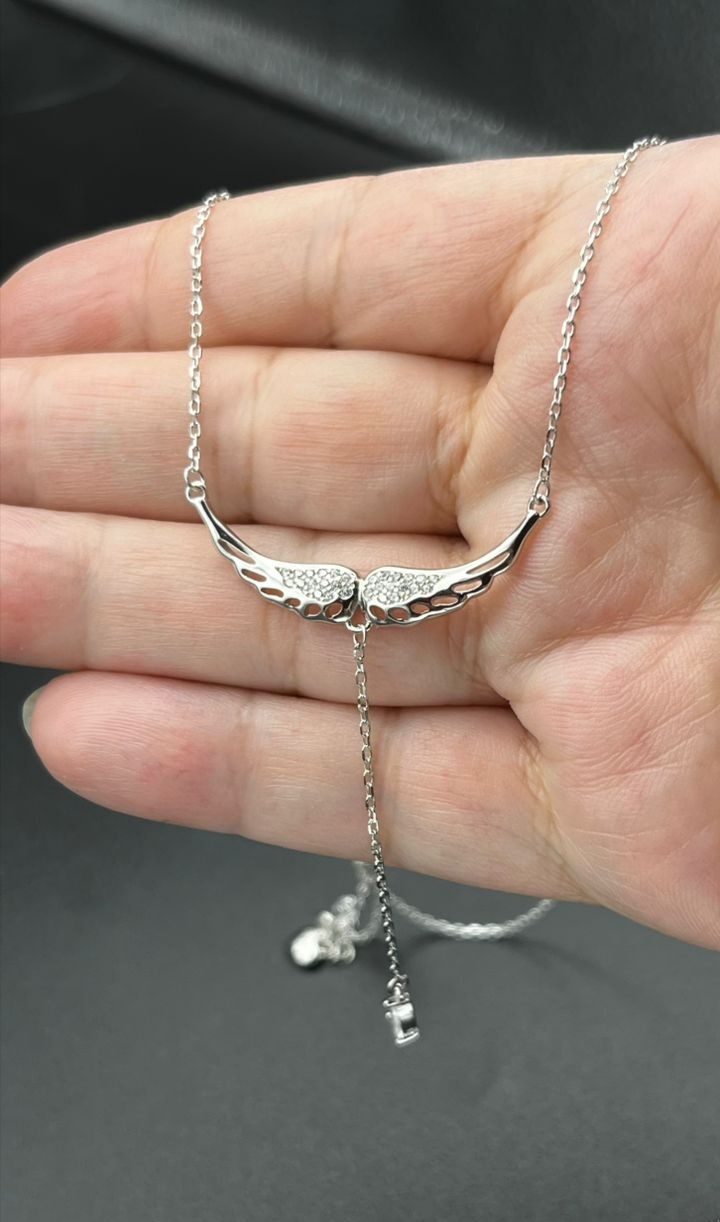 گردنبند نقره با طراحی بسیارشیک بال فرشته با 4سانت زنجیر اویزان در وسط، اندازه زنجیر 40و سه سانت زنجیر رگلاژ دارد، جنس نقره 925 آبکاری شده، فاکتور همراه سفارش ارسال میگردد